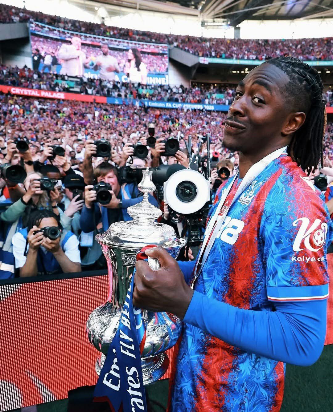 He scored from outside the box in the FA Cup semi-final vs Villa, then sealed Palace’s first-ever major trophy with a volley against Manchester City in the final (Wikipedia).