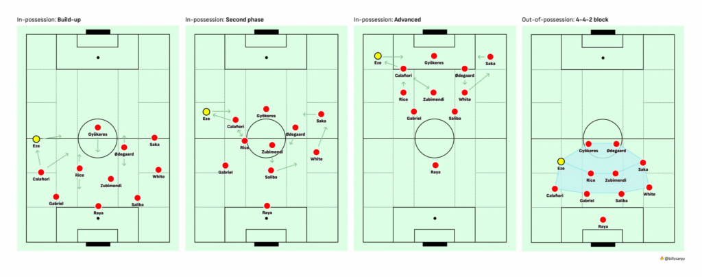 Another underrated part of Eze’s game is how effective he can be on the left wing. This matters because while Martinelli and Trossard are excellent, their profiles are similar in some ways.